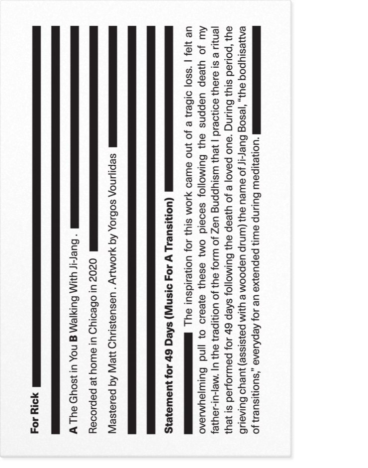 The Ghost in You is structured around a field recording that I made of the carillon at Rockefeller Chapel on the campus of University of Chicago. I recorded it many years ago while I was on a guided tour of the carillon tower. By pitching the speed down I noticed that the recording had an elegiac quality that I have never quite found a suitable use for until this idea. From this starting point I built a composition of sounds from homemade instruments and contact mic’d gong and ride cymbal. The name of this track references The Psychedelic Furs song by the same name. I’ve always loved the poetry of this title, it seems to imply that in the midst of living we are all ghosts, constantly in a state of transition.